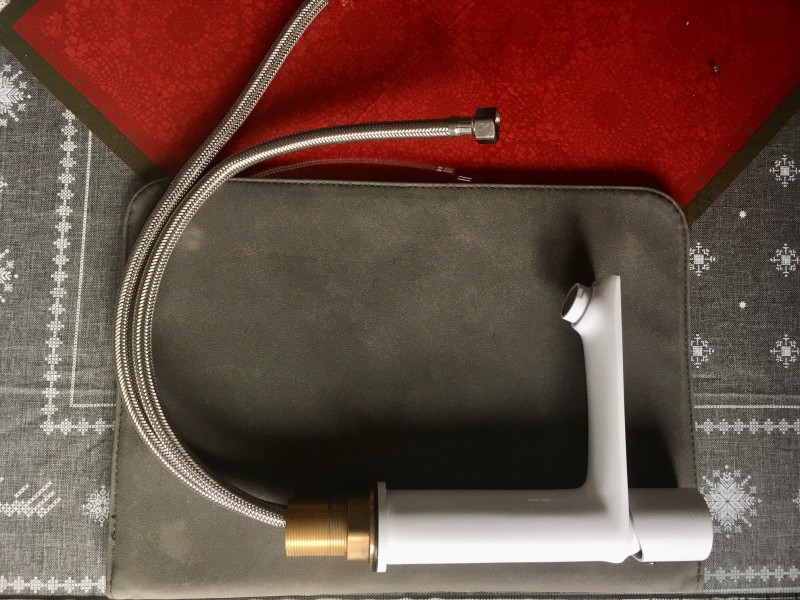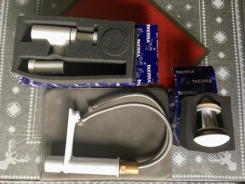 KRASNA DIZAJNOVA BIELA UMYVADLOVA BATERIA (povodne 52 EUR), BIELY KLIK-KLAK (povodne 19 EUR), BIELY NEREZOVY SIFON (povodne 29 EUR, avsak je zrezana jedna rura sifonu, aby sa dalo nasadit na male umyvadlo, takze nemusi tato cast sediet na vacsie umyvadla).