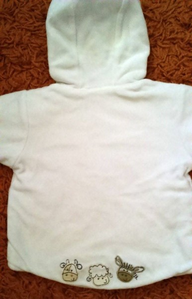 Biely teplejší kabátik pre 3-6 mesačné bábatko, s bodkovanou podšívkou a ovečkovým vzorom na kabátiku. Zadná časť kabátika je poloblúková a dlhšia . Na ďalšie otázky rada zodpoviem :-) CENA S DOPORUČENÝM POSTOVNYM A BALNYM je 4,90 eur
