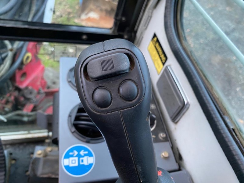 Vybavení: kabina s topením, odpružené sedadlo, rádio, výklopné okno, stěrač, automatické snížení otáček, pojezd želva / zajíc, osvětlení, přední radlice, hydraulický rychloupínák Martin s oboustranným uchycením, jeřábovací háček, hydraulické vývody na rameni - drapák, kladivo, sklopná kabina.