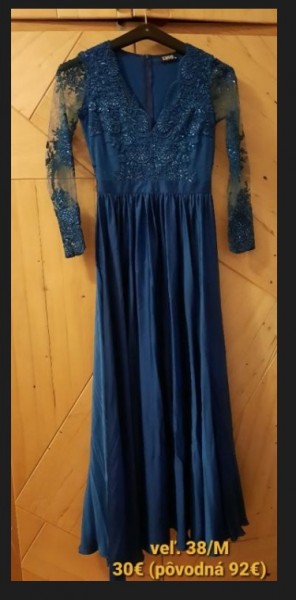 Šaty s čipkou - farba petrolejová / zn. Luxie, majú malé poškodenie na lakti na jednom rukáve vo veľkosti 2cm.