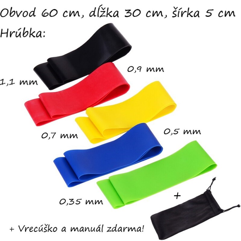 Set posilňovacích gúm Resistance 5 pozostáva z 5 piatich posilňovacích gúm s vrecúškom, ktoré skvelo precvičia celé telo. Rôzne stupne odporu jednotlivých posilňovacích gúm ocenia začiatočníci ale aj pokročilí, nakoľko budete môcť tréning prispôsobiť vašim požiadavkám. Posilňovacie gumy vám poslúžia nie len pri domácich tréningoch, ale aj v posilňovni či outdoorovom tréningu. Obvod 60 cm (dĺžka 30 cm), Šírka 5 cm, Hrúbka 0,35 mm - 0,5 mm - 0,7 mm - 0,9 mm - 1,1 mm.