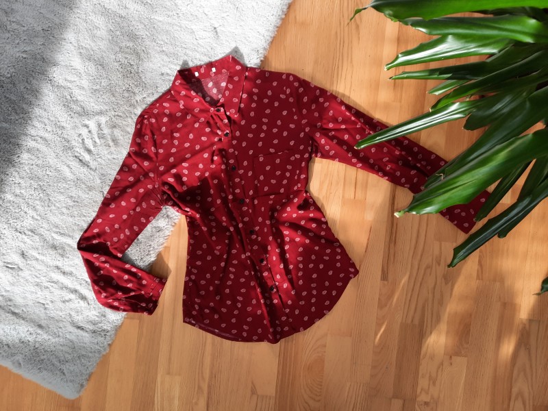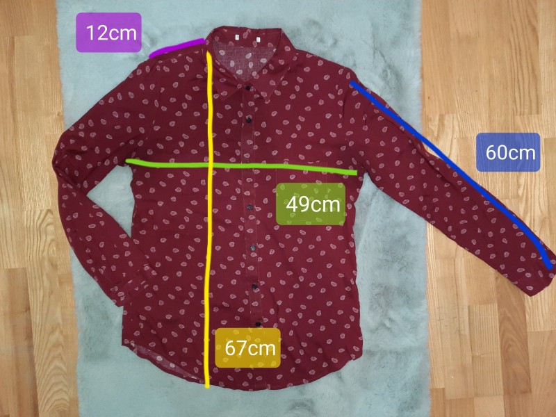 Štítky bohužiaľ odstrihnuté. Ak si dobre pamätám, tak veľkosť M (rozmery na fotke!) Nosená, ale zachovalá. Farba skôr do bordova.