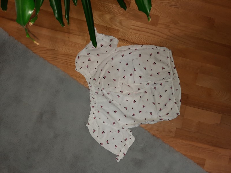 pár krát nosená VOĽNÁ, ľahká blúzka. štítky odstrihnuté, ale TIPUJEM: veľkosť cca 152, a obchod H&M. môže sa nosiť s odhalenými pleciami (nachádza sa tam gumička), alebo normálne ako "tričko"