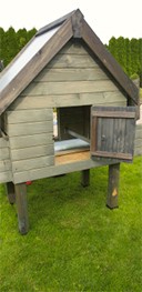 Kurín je na vysokých nožičkách, výška 50 cm, kde sa pokojne môžu schovať kuričky pred dažďom.