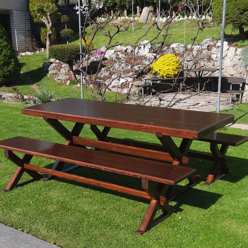 záhradný stôl s lavičkami masív smrek rozmery stola 230x80 lavičky 230x40 farba orech úplne nový pred 2 dňami som ho dokončil lavičky sú presne prispôsobené k stolu a vášmu pohodliu na jednu lavicu sa zmestia 5 ľudia dokopy 10 miestny stol