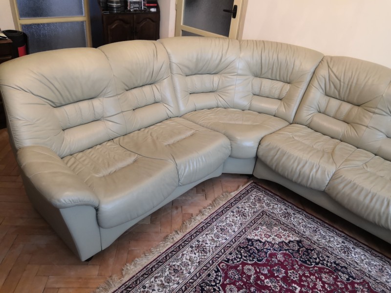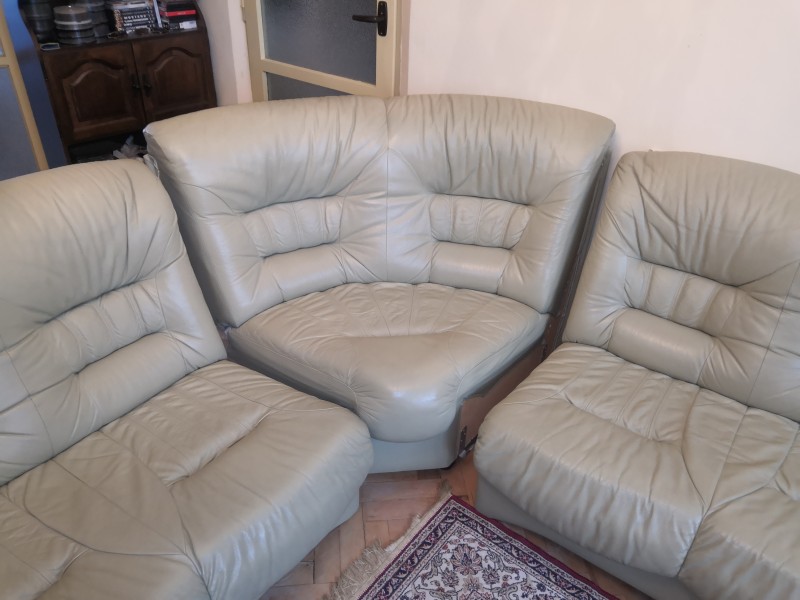 Kožená sedacia súprava v zachovalom stave v bledozelenej farbe. Sedačka je rozložiteľná na 3 časti a má cca 13 rokov.