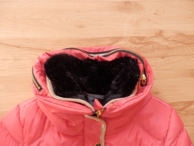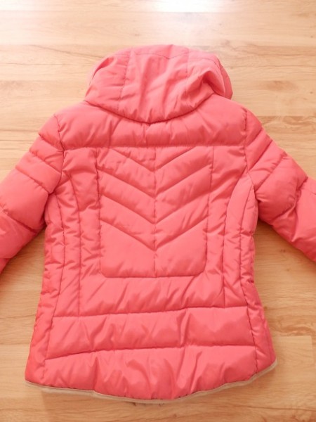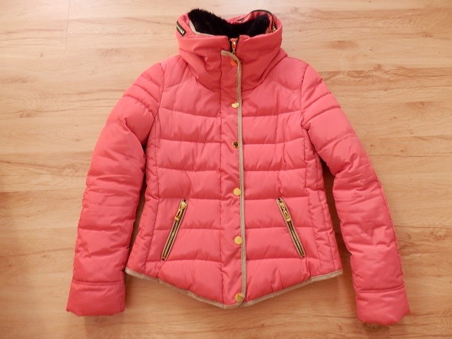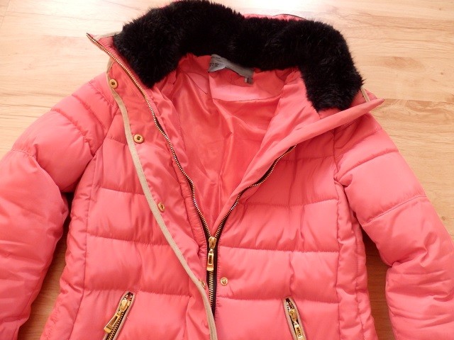 bunda je nepremokavá, veľkosť M, koralová/oranžová farba, zlatý zips a gombíky, okolo krku kožušinka, bez kapuce, rozmery: obvod hrudníka: 2x42cm, celková dĺžka: 56cm, dĺžka rukáva: 65cm