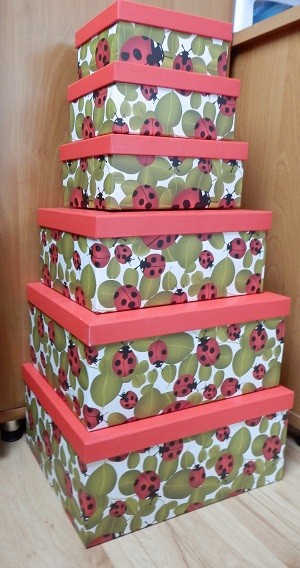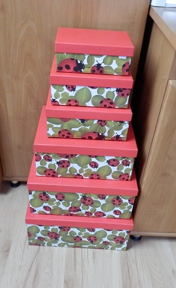 spolu 5 kusov ozdobných krabíc, cena za všetky spolu, možnosť kúpy aj samostatne 4€/kus, rozmery dxšxv: - 33x24x14 - 28x21x12 - 22x16x9 - 20x14x8 - 18x12x7, vhodné ako krabice pod vianočný stromček