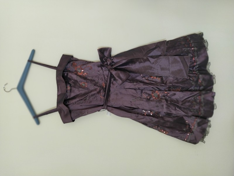 Predam kratke spolocenske saty vel.38-40. oblecene raz na stuzkovej, chemicky cistene ale stali v skrini takze by som ich odporucala dat profesionalne vyzehlit. Su na ramienka, podsita sukna. V pase maju 38cm, dlhe su 108cm z toho 14cm su ramienka.