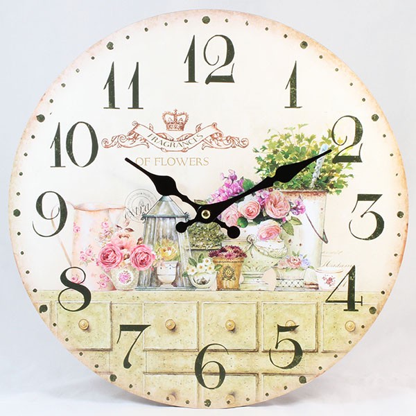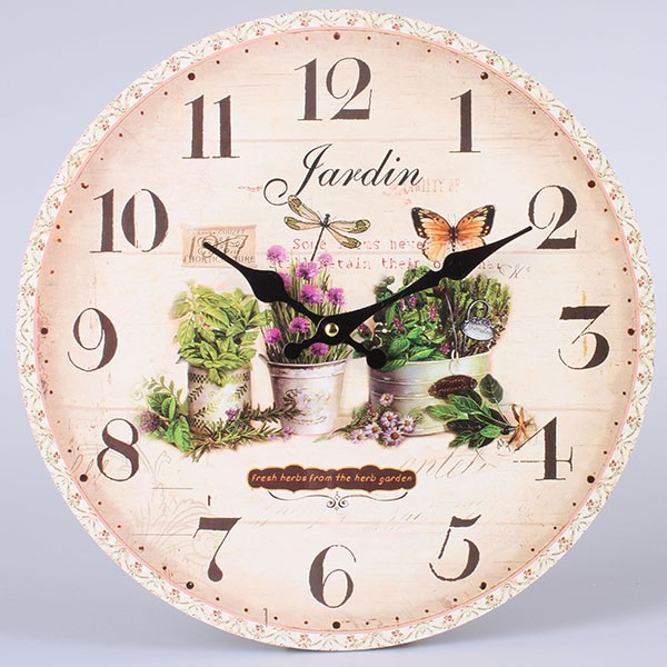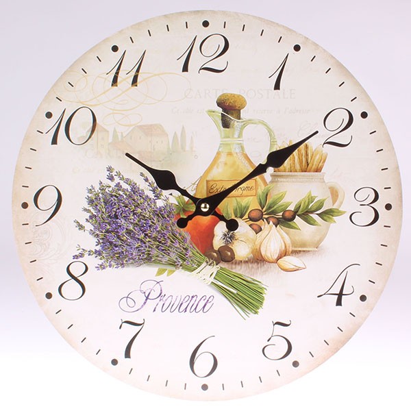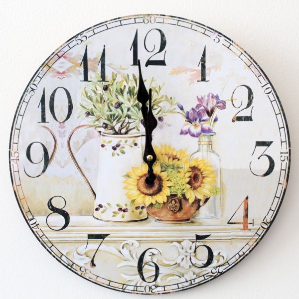 Nástenné hodiny s potlačou. Podložka MDF s obrázkom. Patinovaná povrchová úprava. Hodinový strojček na jednu baterku 1,5 V (tušková baterka nie je súčasťou tovaru). Vhodné do interiéru.