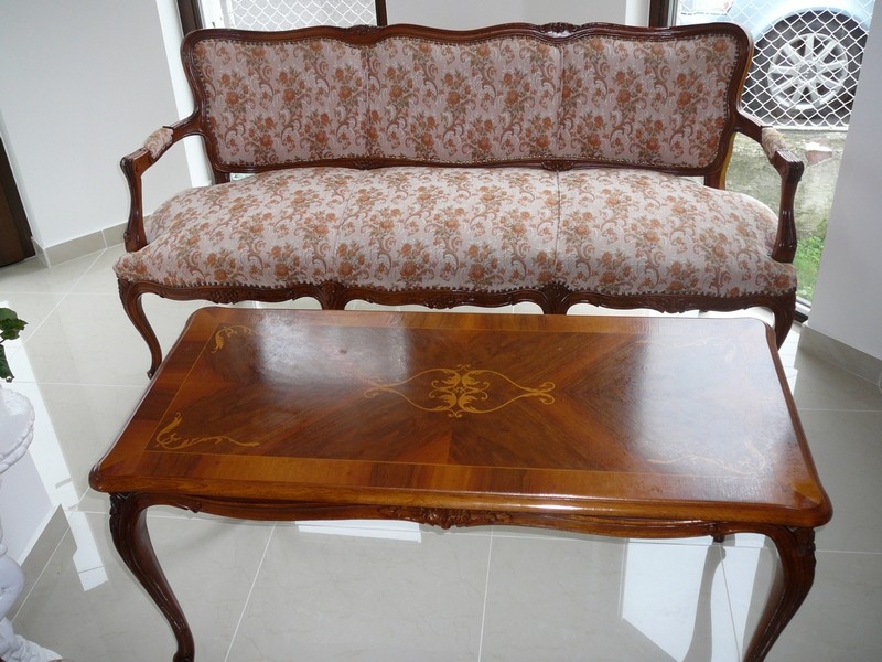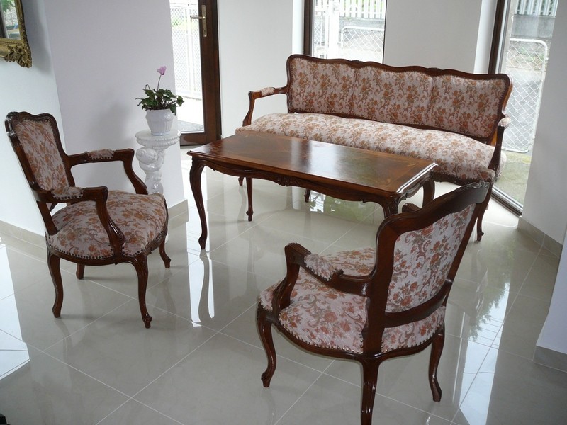 Predám sedaciu súpravu v štýle baroko minimálne používanú. Konštrukcia je pevná je to ručne vyrezávaný buk. Poťah je ako nový. Okolo poťahu použité ozdobné kovové nitovanie Na stole je intarzia z niekoľkých druhov dýh. Jedná sa o trojsed, dve kreslá a stôl. Cena za všetko 1400euro.