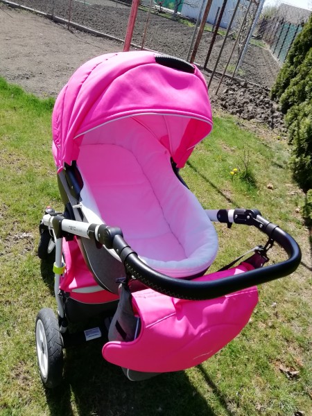 Autosedačka vo farbe kočíka + strieška, kryt na nôžky, 3-bodové bezpečnostné pásy, mäkká výstelka pre najmenšie deti a sieťka do autosedačky.
