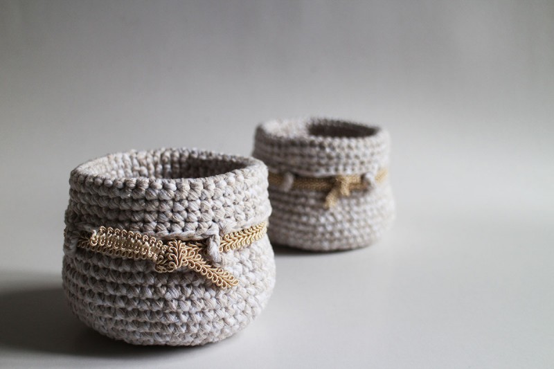 Pevný háčkovaný košíček zdobený zlatou krajkou, ktorý je vhodný na uskladnenie rôznych drobností.