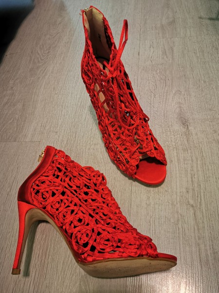 Prekrásné ohnivo-červené sandále vzadu na zips s možnosťou prispôsobiť šírku sandálov s predným uväzovaním. Nové