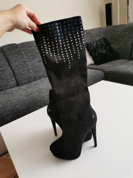 Predám elegantné čižmy na platforme tmavomodrej farby pod kolená jedenkrát obuté. Veľkosť 36