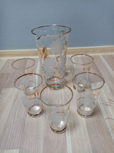 Predám nápojový set – džbán a 5 pohárov na limonádu. Dizajnové tenkosklenné móserové sklo je kombinované so zlatým prúžkom a kvetinovým vzorom v bielo–zlatom prevedení. Ide o exkluzívny set v krásnom stave bez poškodenia. Rozmery džbánu: výška 23,5 cm, horný priemer 13 cm, spodný priemer 7,5 cm. Rozmery pohára: výška 13,5 cm, horný priemer 8 cm, spodný priemer 5,5 cm. Cena za set 45 Eur + poštovné. Dohoda možná.