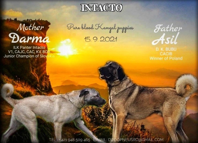 Matka: Darma Ilk Panter Intacto (V1,CAJC,CAC,KV,BOB,Slovenský šampión šteniat) Povahovo veľmi vyrovnaná, s deťmi nesmierne priateľská, kontaktná, opatrná, no napriek tomu silný typ v ochrane svojho územia. Vyrastala vo svojom prirodzenom prostredí - medzi ovečkami, vo veľkom výbehu. Tiež je v neustálom kontakte s malými deťmi a je voči nim absolútne tolerantná. Tak ako matka , tak aj šteniatka majú voľnosť výbehu vo veľkom priestore, kŕmenie prioritne z kvalitného krmiva. Darma je tmavší typ Kangala ( najmä v maske ), takže šteniatka majú taktiež tmavšie farby. Ešte sa ,,vyfarbujú,,.