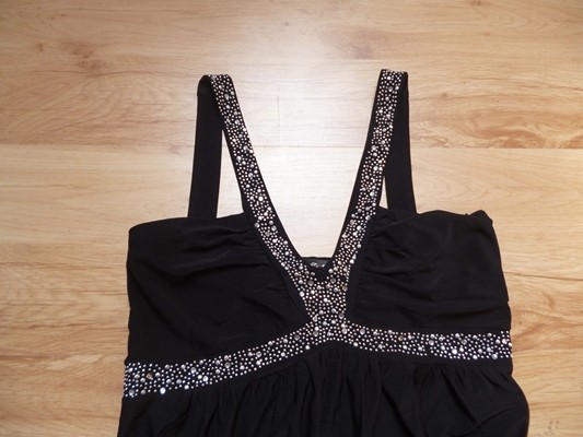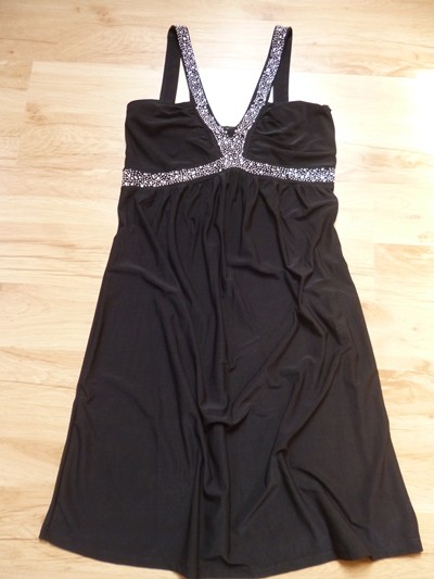 nové dámske šaty, veľkosť S/M, ramienka a dekolt zdobené kamienkami striebornej farby, voľnejšie na bruchu, 95% polyester, 5% bavlna