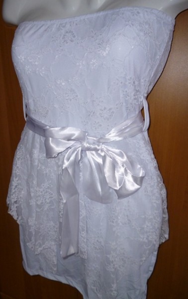 bez ramienok, ozdobná saténová mašľa, mašľu je možné nepoužívať, veľkosť uni, dĺžka šiat je 63cm, šírka pod pazuchou je v kľudnom stave 30cm, v natiahnutom až 40cm, pod pazuchou je gumička