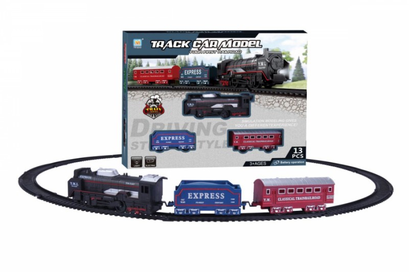Vlaková súprava , v balení je 23 častí, lokomotíva 14 cm dlhá so svetlom a 2 vagónmi, v a koľajnice. Rozmer poskladaných kolajníc priemer 86cm. Batérie do lokomotívy 1 x AA 1,5 V nie su súčasťou balenia.