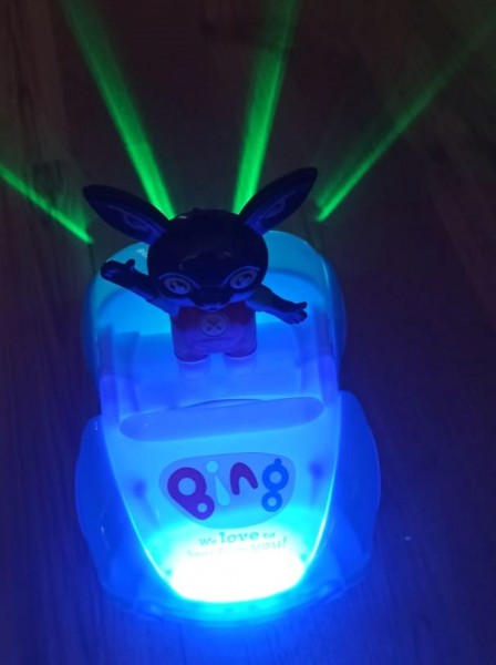Ponúkam na predaj zajaca Binga na aute na baterky, svieti , hrá melódiu, chodí do všetkých strán a pri náraze zmení smer jazdy. Dĺžka je 20 cm.