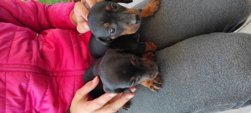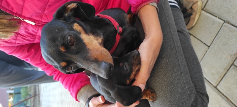 Obaja rodičia (trpaslíčí jazvečík) sú na foto. Šteniatka už papaju samé a sú veľmi hravé vhodné aj k detičkám.