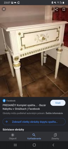 Predám zachovalú spálňu ĽUDVIKA XIV. Troj skriňa, manželská posteľ, dva nočné stolíky a toaletný stolík zo zrkadlom.