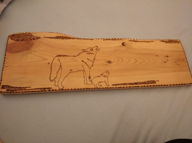 Predám obrázok s koňmi a vlkom vypálený do dreva s rozmermi cca 62×20 cm. Vypálené s vypalovačkou a samozrejme aj s láskou. Ručne vypalované. Je to obojstranne vypálné. Na jednej strane sú kone a na druhej vlci