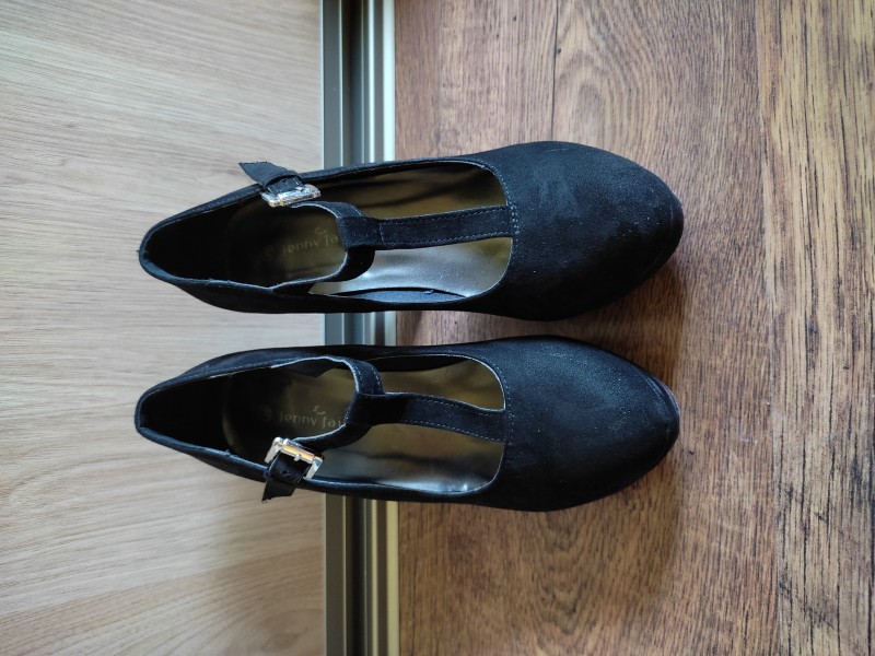 Topánky nosené párkrát. Topánky majú zapínanie vpredu, semišové s červenou podrážkou.