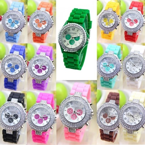 Predám nový typ hodiniek zn. Geneva, ciferník priemeru 4 cm je zdobený po celom obvode krásne sa lesknúcimi kamienkami typu swarovski vo dvoch radoch. Príjemne mäkký a pohodlný silikonový remienok dĺžky 25 cm v módnych pastelových farbách, v strede ciferníka tri malé ciferníky majú ozdobný charakter, váha len 54 g