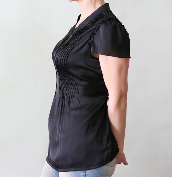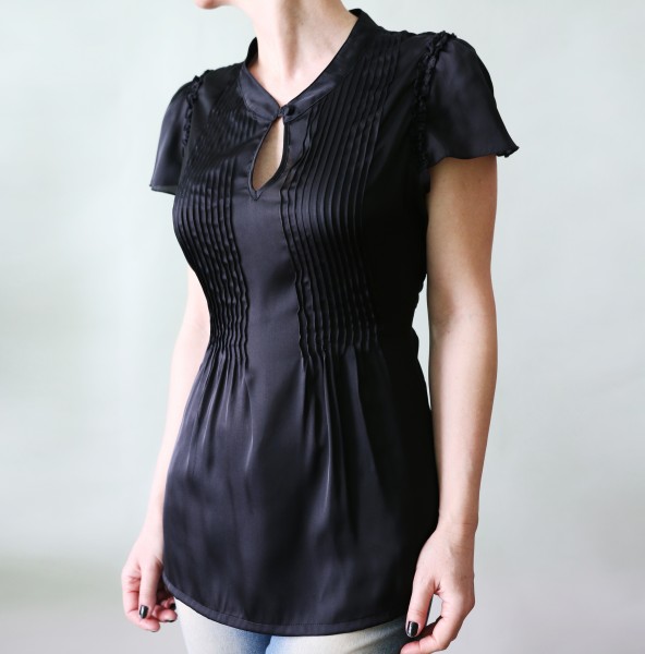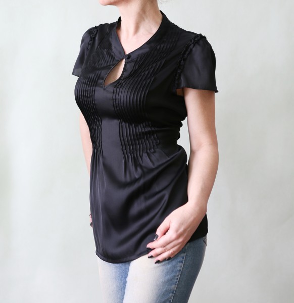Čierna krásne prepracovaná saténová blúzka Tara. Predný diel je ozdobený drobnými sámikmi, ktoré sa od pása dole otvárajú a tvarujú tak peknú ženskú siluetu. Oblieka sa cez hlavu, zapína na slzičku, vzadu je tenká viazačka. Okolo prieramkov malinkaté volániky. Materiál je 100% polyester, ale kvalitný, na omak hebký ako hodváb. Veľkosť L, prosím merajte. Rozmery: ramená 35 cm. prsia 109 cm, pás 94 cm, boky 118 cm, dĺžka 70 cm, dĺžka rukáva 16 cm, prieramky dokola 52 cm. Je nová, nenosená, top stav. Pošta 2,5€. alebo Zásielkovňa 3€ pri platbe vopred.