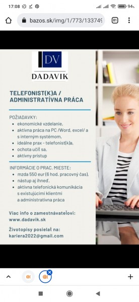 Telefonista(k)a/administratívna práca Košice