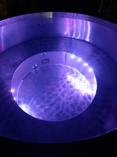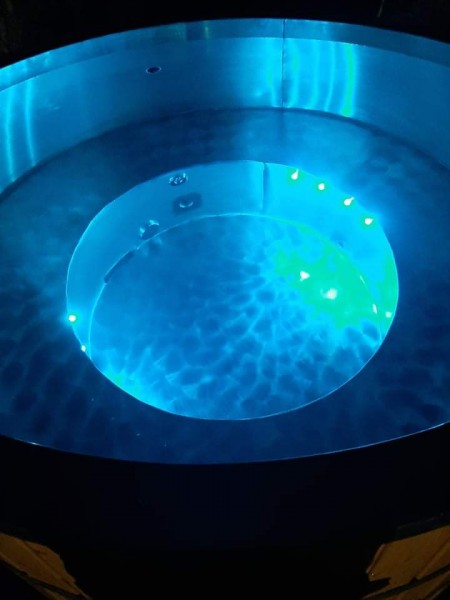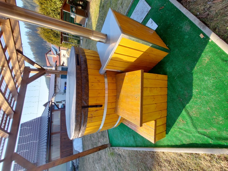 Nerezová kúpacia kaďa, zateplenie, obklad, piecka, rošt, popolník, komín so strieškou, výpustné ventily, schodíky a príprava na filtráciu.