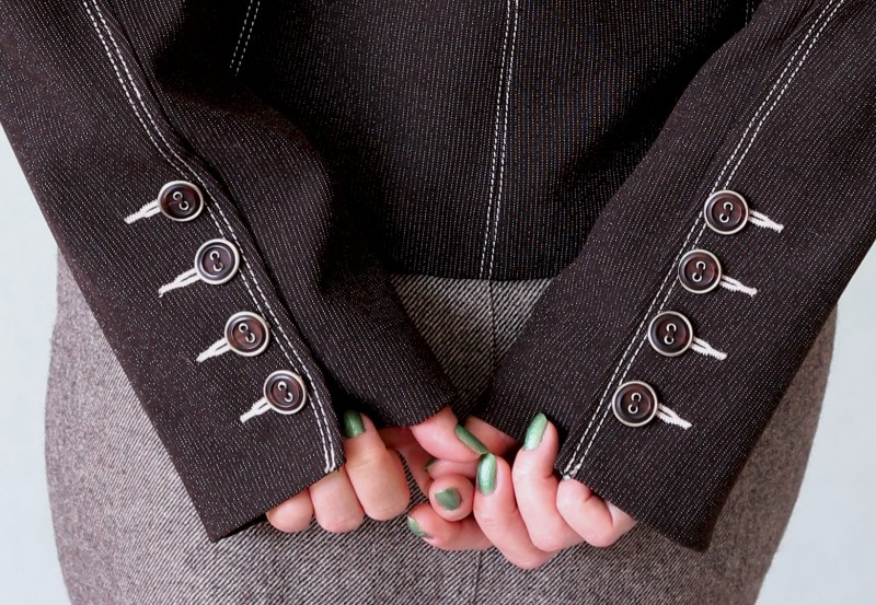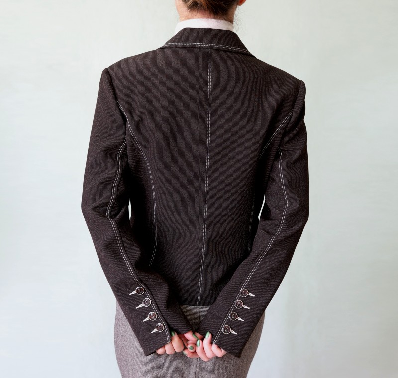 Tmavohnedé sako s jemným skoro neviditeľným svetlejším hustým prúžkom, veľmi pekne a kvalitne vypracované, s množstvom zaujímavých detailov - biele štepovanie, ozdobné gombíky, čiernym lemované vrecká. Materiál polyester, tuhší, mierne pružný, pekne drží tvar, vôbec sa nekrčí. Podšívka hnedá, polyester. Veľkosť 44, rozmery: šírka ramien 42 cm, prsia 102 cm, pás 90 cm, boky 104 cm, dĺžka 61 cm vpredu, 56 cm vzadu, dĺžka rukáva 62 cm. Sako sa dá prať v ruke. Nebolo nosené, top stav. Pošta alebo Zásielkovňa 3,5€ pri platbe vopred.
