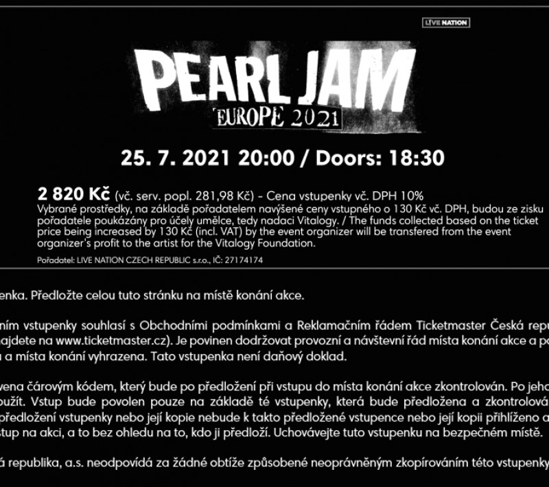 Predam 2ks vstupeniek (90 € kus) na koncert skupiny Pearl Jam v prazskej O2 Arene dna 22.07.2022.