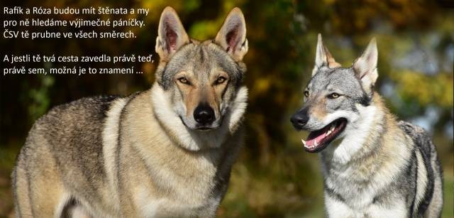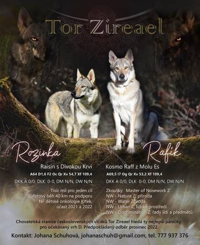 Matka: Raisin s Divokou krví, A64 D1,6 F2 Oc Qr Xv54,7 Xf109,4 (CZ) Chovná I. Naše Rozinka je středně vysoká fena, s výbornou kostrou a formátem. Má krásný vlčí pohled s šikmým žlutým okem. Otec: Kosmo Raff z Molu Es, A69,5 I7 Og Qr Xv 53,2 Xf 109,4 Chovný I. Raffík je vysoký pes se silnou kostrou a s výborně uloženým světlým okem. S výbornou povahou, temperamentní, s vlohami pro pachové práce. Oba rodiče negativní DKK, DLP, čistí na DM, DW