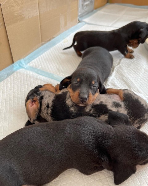 Ponúkame na predaj trpasličích jazvečíkov 3x tmavihnedý až čierny s bielym fľakom na hrudi, 3x merle. Už máme len psíkov, fenka je predaná. Dostupní na odber od polky Novembra. Len do dobrých rúk.