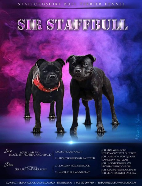 Predam krasne steniatka Staffordshire Bull Terrier s PP, po vybornych rodicoch sampionoch, Farba black/brindle. Steniatka, 2 chlapci, su odcervene,zaockovane a cipovane. Odber mozny ihned