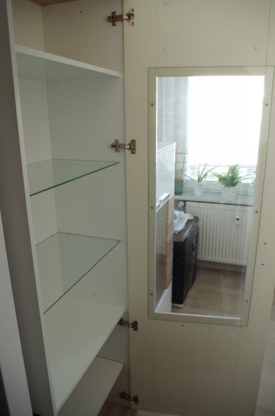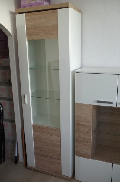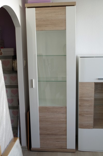 Úchytka bola namontovaná vertikálne na bielej časti dverí vyššie namiesto pôvodného horizontálneho uchytenia nižšie na stednej drevodekorovej časti. Zo zadnej strany skla (z interiéru vitríny) v spodnej časti je tenký škrabanec, ktorý sme si normálne nevšimli.