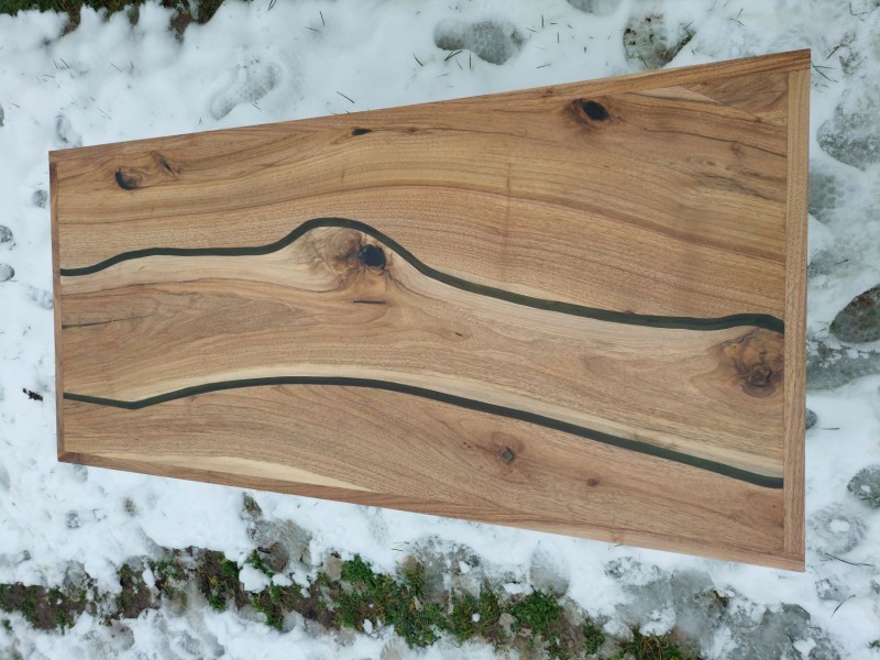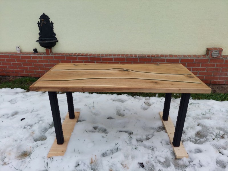 Predám tento čisto nový masívny orechový stôl s epoxidovanými časťami. Stôl má oceľový rám a masívne oceľové nohy ktoré sú zakončené pätkami z orechového dreva. Doska je hrubá 4 cm a ošetrená je niekoľkými vrstvami oleja s voskom, nohy a rám sú natreté matnou čiernou. Šírka je 73 cm, dĺžka 156 cm a výška 76 cm. Cena dohodou. 0915265185