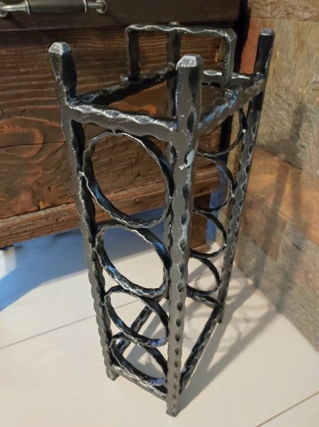 Predám stojan na víno na 4 fľaše s praktickým uchytom na prenos. Pevný a stabilný stojan. Ručná výroba. Stojan je celokovovy. Čierna farba, strieborná patina.Výška 50 cm, šírka 13cm, hĺbka 21 cm. Cena 70€.