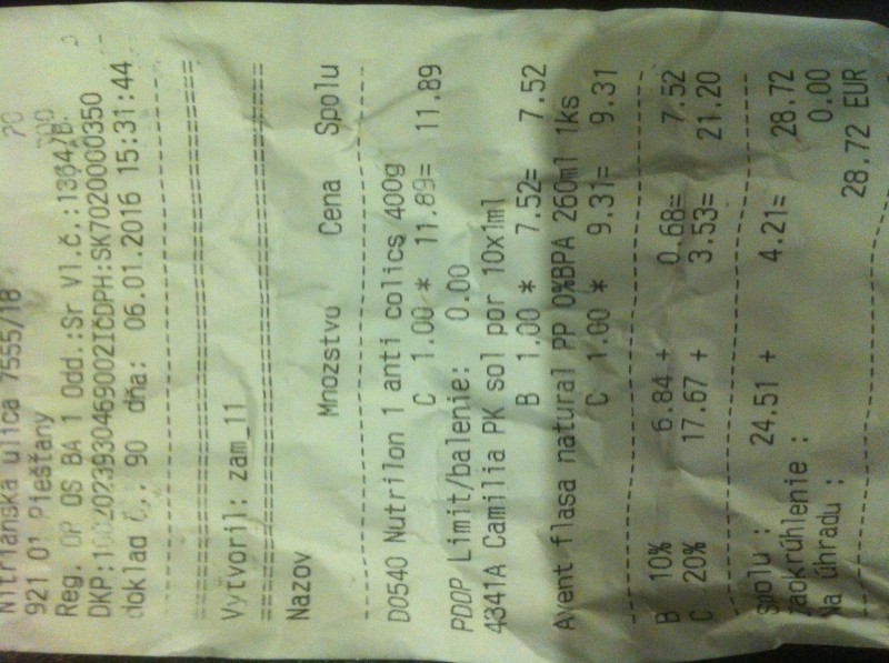 Nutrilon 1 anti- colics Kúpený 9.1.2016 Odobratá jedna dávka . Záruka do 4. 3. 2017 Prikladám fotku bloku. cena 11. 89.-€ Poštovné zdarm