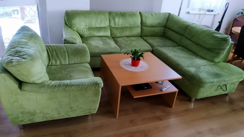 Predám rozkladaciu sedaciu súpravu s úložným priestorom + kreslo. rozmer kresla 110 x 85 x 85 (dĺžka x šírka x výška) rozmer sedačky : 235 x 200 x 85.