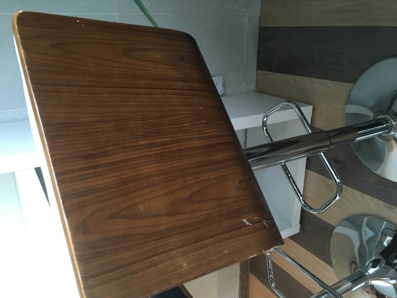 Predam barovy stol v bielej farbe, s dvoma polohovacimi stolickami. Vyska celkovo 200 cm, sirka celkovo 60 cm, vyska stola 109 cm, sirka stola 50 cm, dlzka stolovej dosky 114 cm. Policky su 4, dostatocne hlboke. Mozno pouzit aj do priestoru ako predel, nema zadnu stenu (ta ktora sa na fotkach opiera o sedu stenu). Na cene sa da dohodnut, vopred, vyjednavanie na mieste uz nie je mozne. V pripade rychleho jednania dreveny zasobnik na caj v cene.