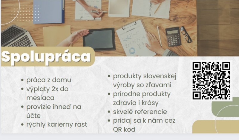 Hľadám šikovných ľudí, ktorí vedia tvoriť tím. Práca je pre slovenskú firmu s prírodnými produktami na báze regenerácie buniek. Produkty sú vhodné pre zdravie i krásu. Jedinečný odmeňovací systém, kde výplaty vám prídu 2x do mesiaca, provízie máte ihneď v kancelárií, karierny rast, z pozície sa nepadá, navzájom si pomáhame. produkty viete ponúkať aj do lekárni, kozmetičkám, masérom atď. Pre viac info správa alebo cez obrázok registrácia.