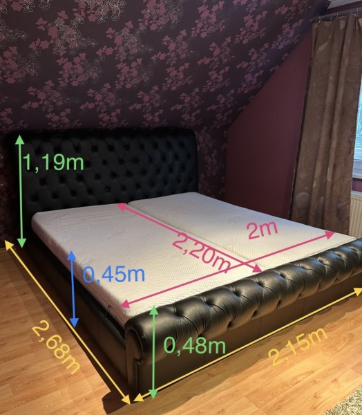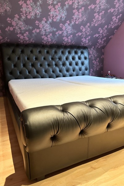 Predám veľkú čiernu manž.posteľ z pravej kože. Posteľ je v TOP stave. Rozmery nájdete na fotke. Pevná konštrukcia s mäkkou čalúnnenou kožou. Vyčistené kvalitné Moravia Comfort matrace so 7 samostatnými anatomickými zónami. Na jednej strane poťahu matraca maličké chyby.