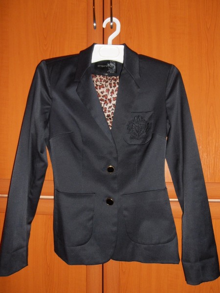 Ponúkam dámske sako (na štýl školskej uniformy), zapínanie na zlato-čierne gombíky, vpredu 2 vrecká, tigrovaná podšívka, možnosť odohnutia rukávov, veľ. 36 - možnosť úpravy veľkosti (zúženie/rozšírenie) prešitím gombíkov (rozmery na obr.), farba tmavo modrá, príjemný nekrčivý materiál, veľmi kvalitné spracovanie.