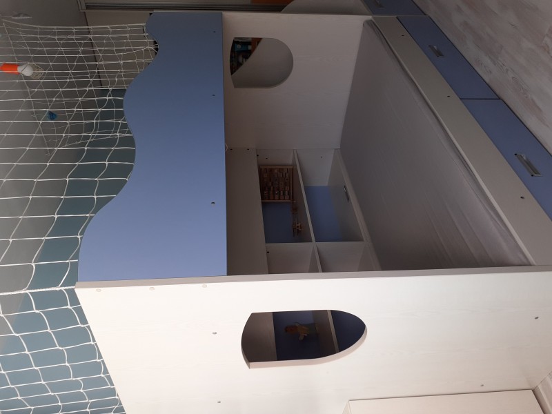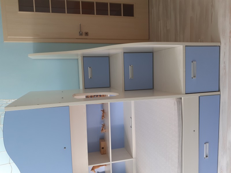 Predám poschodovú posteľ. Posteľ má dva veľké spodné šuplíky, tri šuplíky v schodíkoch, dva perináče, poličky, a pochôdznu plošinu na poschodí, a malý nočný stolík na poschodí. Rozmer: d = 248 cm, š = 140 cm, v = 170 cm. Rozmer matracov: 200 x 97 cm. Súčasťou je sieť. Posteľ je vo veľmi dobrom stave. Kvalitná, vyrobená na objednávku. Konštrukcia je masívnejšia. Nová stála 3000 €.