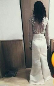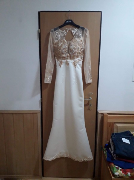 Velkost 34, vzadu sa daju povolit o4 cm. Ja som prva majiteľka, saty su v uzasnom stave ako nove. Davala som si ich sit u krajcirky podla mojho navrhu. Dekolt s cipky perliciek flitrov ,satenova sukna,dlhy rukav,holy chrbet,v zadu rozparok.Cena150€ +postovne alebo osobny odber.