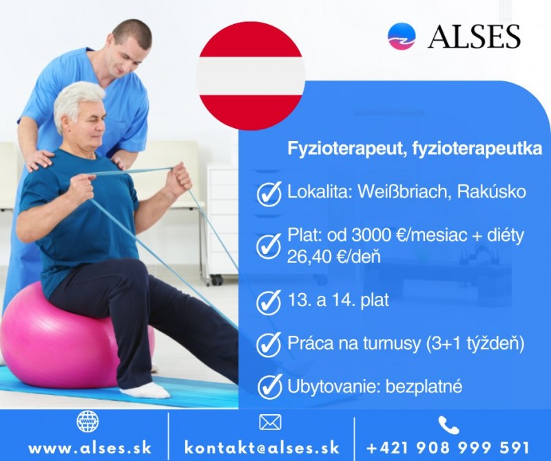 Pracovná ponuka pre pozíciu: fyzioterapeut, fyzioterapeutka v Rakúsku, Weißbriach. Mzda: 3000 €/ brutto na mesiac/ rakúska pracovná zmluva. Diéty 26,40 €/deň. 13 a 14 plat. Príplatky za nadčasy a štátne sviatky. Je možné pracovať turnusovo - 3 týždne a 1 týždeň voľna. Náplň: individuálny liečebný telocvik, skupinové cvičenie, aplikácie fyzikálnej terapie pre klientov po úraze, s pľúcnymi ochoreniami a neurologickými ochoreniami. Ubytovanie je hradené v plnej výške. Potrebné je uznanie vzdelania "Anerkennung" s ktorým Vám pomôžeme a zápis v Gesundheitsberuferegister